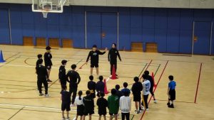 小学1年生から6年生までの参加者約60人は、バスケットボール部の山下新樹監督や部員らの指導で本格的な練習メニューに取り組み、基本的な動きやチームワークの大切さを学びました。